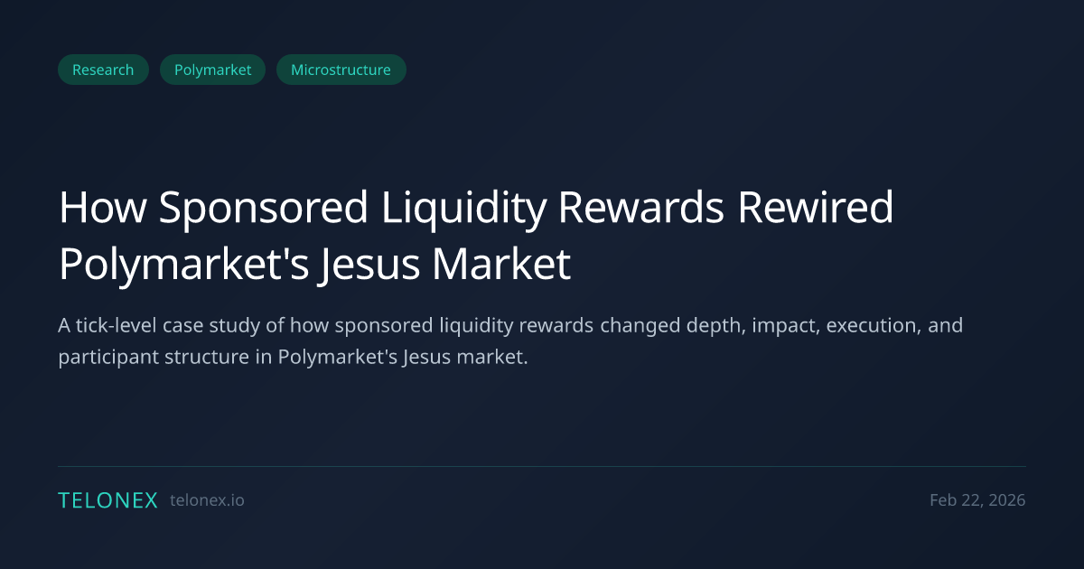 This is a tick-level case study of what happened before, during, and after that moment - using on-chain fills (Nov 25, 2025 - Feb 20, 2026) and CLOB data including trades, quotes, and 25-level orderbook snapshots (Jan 19 - Feb 20, 2026). It's also the clearest real-time demonstration we've seen of how Polymarket's sponsored rewards program can reshape a market's microstructure.