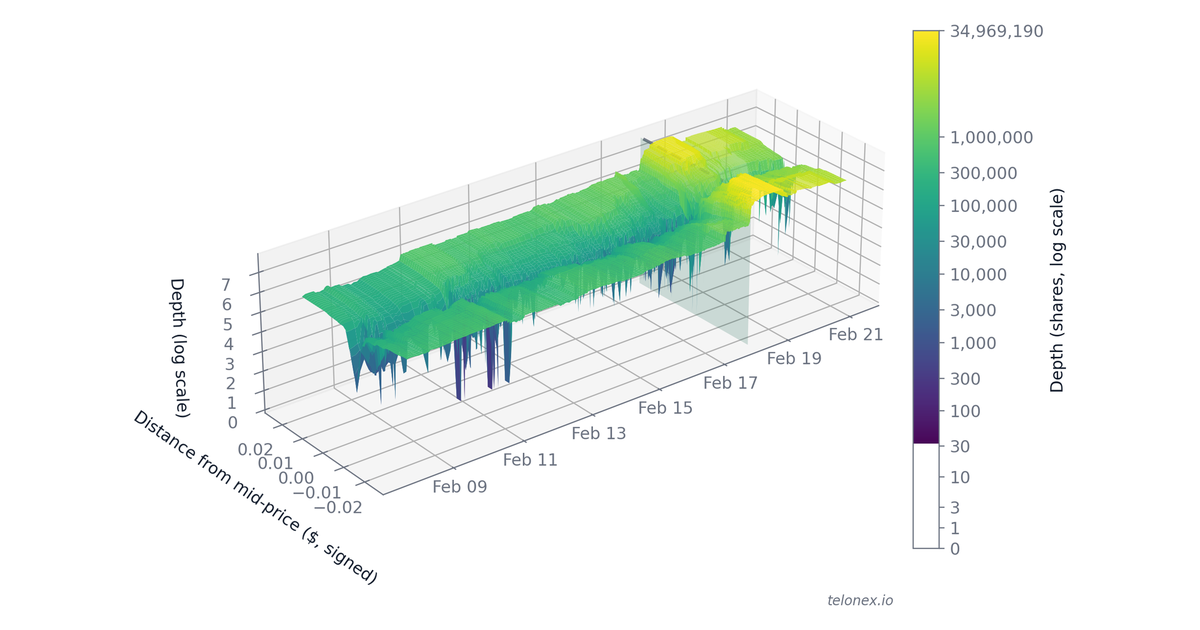 Best bid/ask updated on every top-of-book change for spread analysis and market making research.